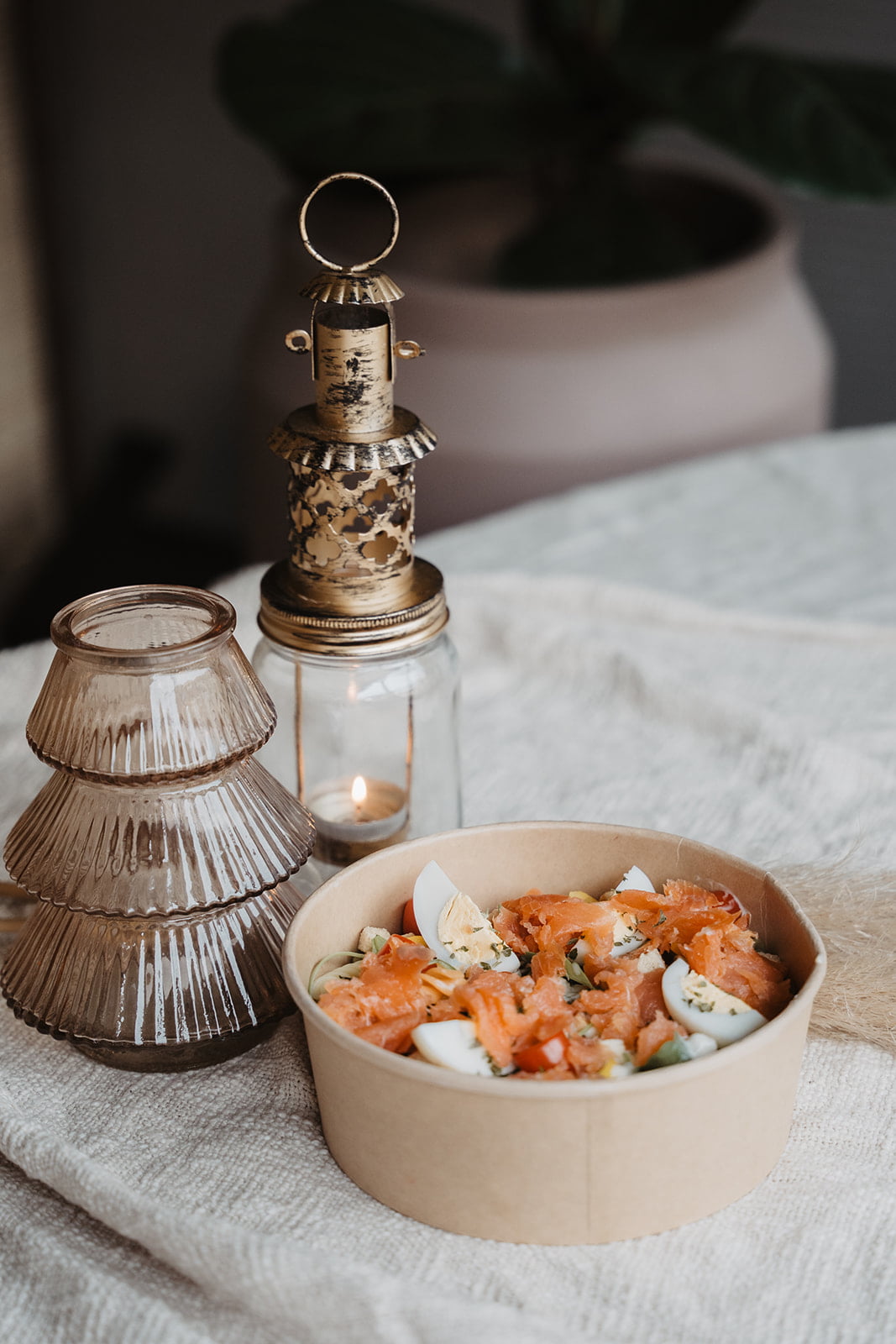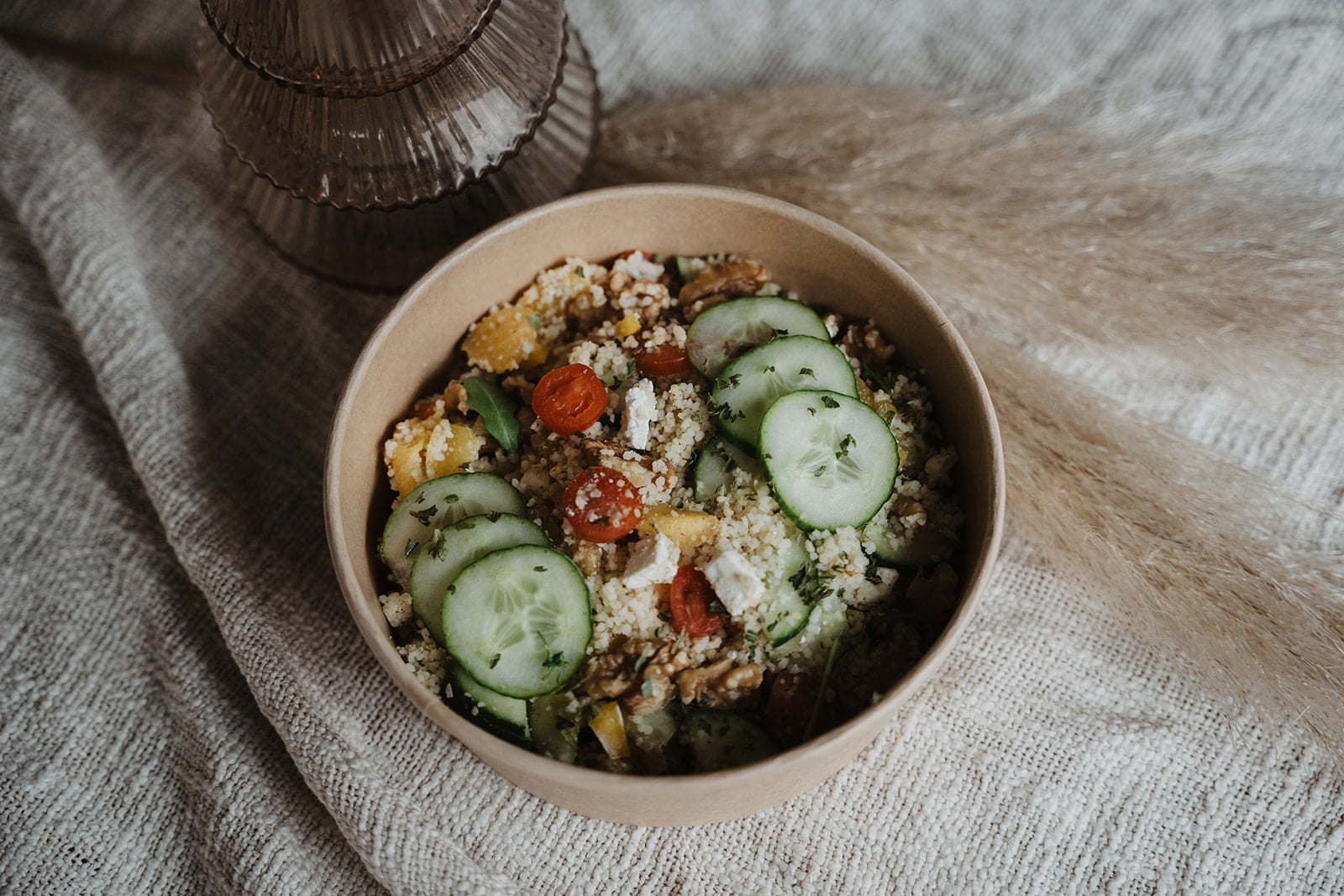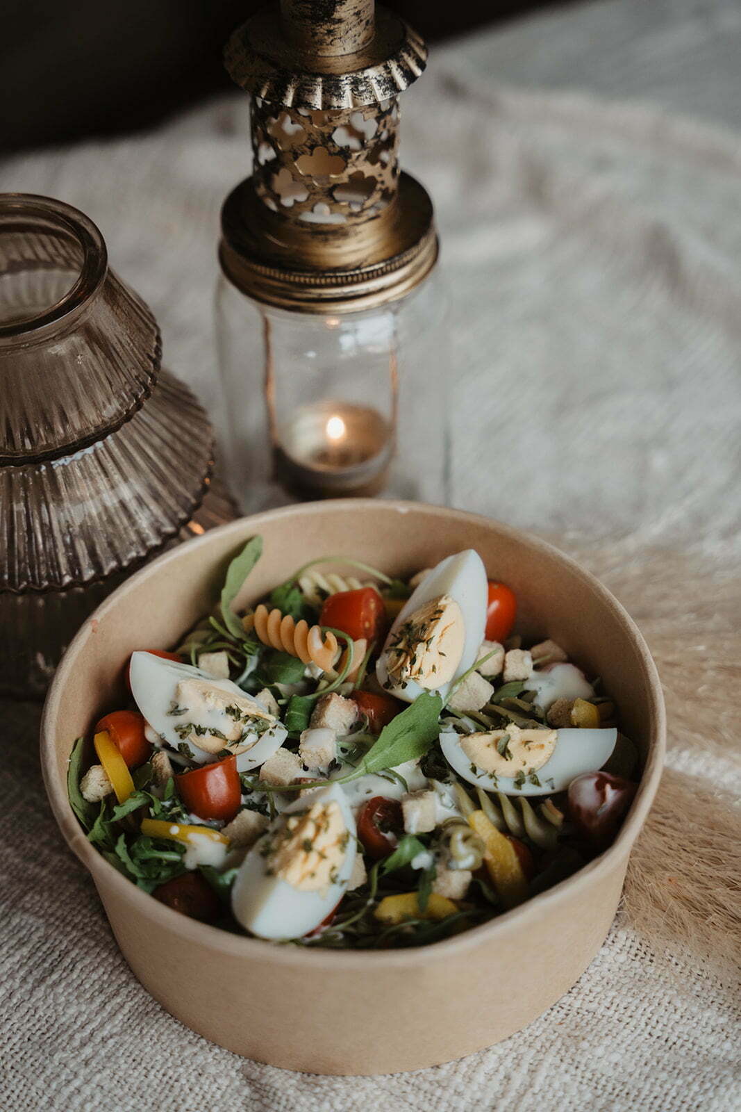 Goedgevulde salades geserveerd met stokbrood met diverse smeersels en een sapje/smoothie. Vanaf 4 personen te bestellen en graag 24 uur van te voren. (Anders even bellen) Je hebt de keuze uit een: – Ceasarsalade met pasta en (vega)kip – Couscoussalade (vega) – Zalmsalade